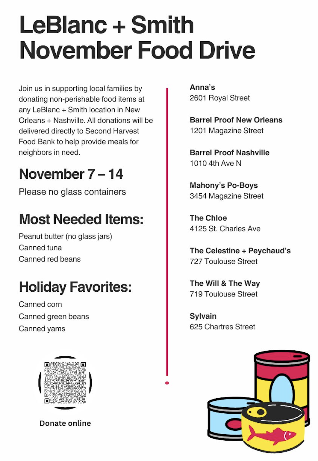 This November, join us in giving back. We’re collecting non-perishable food items and winter clothing for a *LeBlanc + Smith–wide food drive benefitting Second Harvest Food Bank, helping provide meals for local families in need, and Nashville Rescue Mission, helping folks stay warm during the cold winter months ahead.